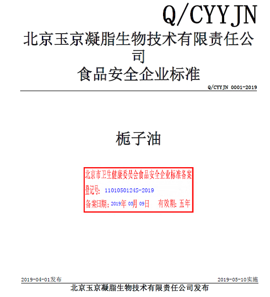 北京玉京凝脂生物技術有限責任公司本次備案的企業(yè)標準《梔子油》,經過我公司技術人員朱麗真老師的編寫、備案,所提交的材料符合北京市衛(wèi)健委的備案要求,于2019年05月成功備案并在北京市食品安全標準管理系統(tǒng)公示。