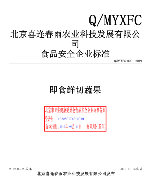 北京喜逢春雨農(nóng)業(yè)科技發(fā)展有限公司本次備案的企業(yè)標(biāo)準(zhǔn)《即食鮮切蔬果》,經(jīng)過我公司技術(shù)人員張炳福老師的編寫、備案,所提交的材料符合北京衛(wèi)計(jì)委的備案要求,準(zhǔn)予備案并在北京衛(wèi)計(jì)委信息網(wǎng)上公示,北京喜逢春雨農(nóng)業(yè)科技發(fā)展有限公司可以按照規(guī)定要求使用已備案的企業(yè)標(biāo)準(zhǔn)。
