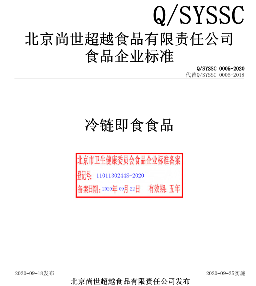 北京尚世超越食品有限責(zé)任公司本次備案的企業(yè)標(biāo)準(zhǔn)《冷鏈即食食品》,經(jīng)過我公司技術(shù)人員黃占先老師的編寫、備案,所提交的材料符合北京市衛(wèi)健委的備案要求,于2020年9月成功備案并在北京市食品安全標(biāo)準(zhǔn)管理系統(tǒng)公示。