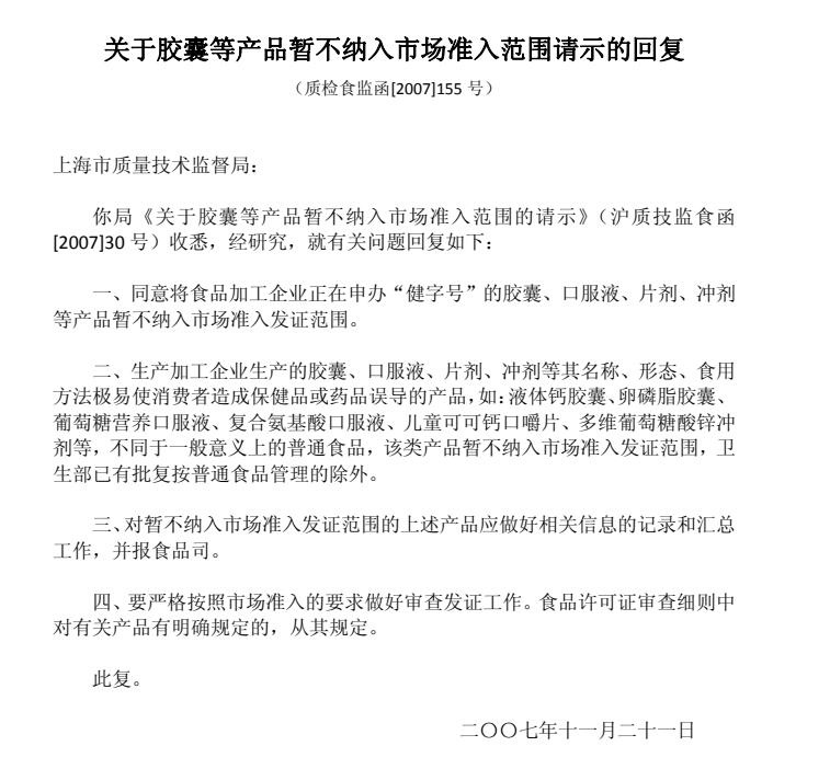 關于膠囊等產(chǎn)品暫不納入市場準入范圍請示的回復